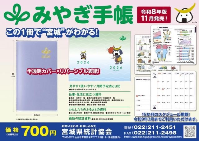 いかがお過ごしですか、nittaです。最新版の宮城県民必携の手帳『令和8年版みやぎ手帳(県民手帳)』の販売が始まってるみたいです。(1冊税込700円)令和8年…