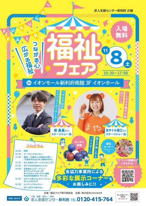 いかがお過ごしですか、nittaです。イオンモール新利府南館3階イオンホールで、『福祉フェア』を2025年11月8日(土)に開催するみたいです。(10-17時…