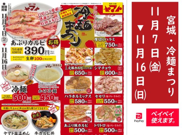 宮城県下の『焼肉冷麺ヤマト』各店で、『冷麺まつり』を、2025年11月7日(金)から16日(日)までの10日間開催するみたいです。【宮城・冷麺まつり】宮城全4…