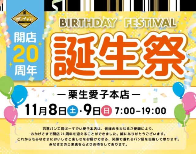 いかがお過ごしですか、nittaです。仙台市青葉区栗生の『石焼パン工房ばーすでい栗生愛子本店』限定で、『開店20周年 誕生祭』を2025年11月8日(土)、9…