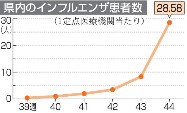 県は6日、第44週(10月27日~11月2日)に報告された季節性インフルエンザの1定点医療機関当たりの患者数が県全体で28・58人になったと発表した。前々週…