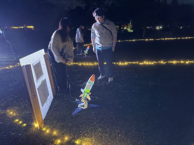 七北田公園で開催されているIZUMINATION会場で、夜の公園にカラフルに光るペットボトルロケットが飛ばせる企画をやっています。芝生広場に飛行場ができてまし…