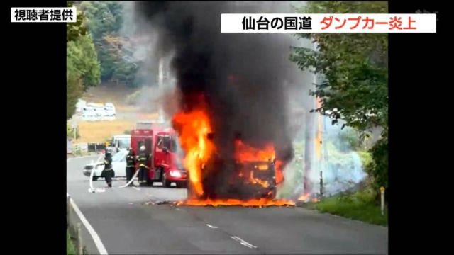 22日朝、仙台市内の国道で走行中のダンプカーが焼ける火事がありました。けがをした人はいませんでした。黒い煙を上げながら燃え上がるダンプカー。人の背丈よりも高く…