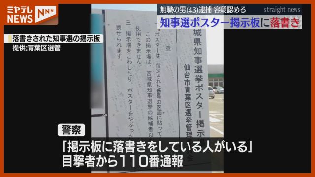 10月26日に投開票が行われる宮城県知事選の選挙ポスター掲示板に、特定の候補者への意見などを“落書き”したとして、無職の男が逮捕されました。