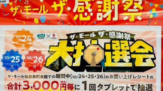 ザ・モール仙台長町で、お得で楽しい感謝祭がスタートしました!感謝祭は2025年10月24日(金)~11月3日(月・祝)の11日間。期間中はお得なセールや各種イ…