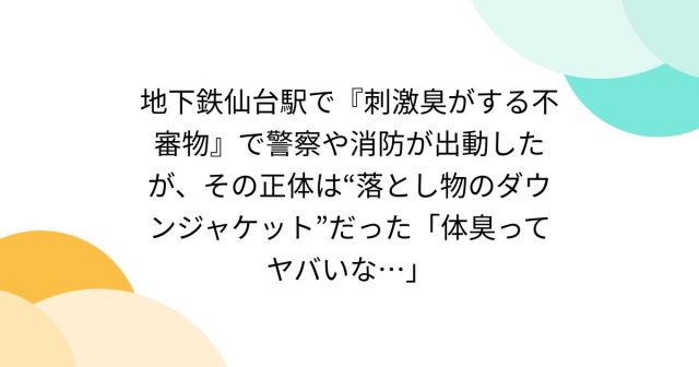 地下鉄仙台駅の「刺激臭がする不審物」 正体は落とし物のダウンジャケット 消防が検知器を使って調べたところ有害な物質などは検出されず、臭いのもとはダウンジャケッ…