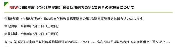 仙台市教育委員会は2025年10月21日、2027年度(令和9年度)教員採用選考の第1次選考の実施日について公表した。第1次選考の筆記試験を2026年7月1…