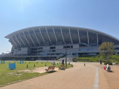 ひろしまゲートパークを抜け、ようやくエディオンピースウイングスタジアムへ。最新式の新スタジアム このサッカースタジアムは、最新式の街なかスタジアムとして2...