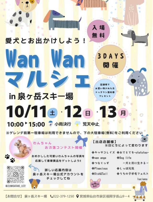 いかがお過ごしですか、nittaです。 仙台市泉区の泉ヶ岳スキー場で、愛犬と楽しめるイベント『wan wanマルシェin泉ヶ岳スキー場』を、2025年10月1…