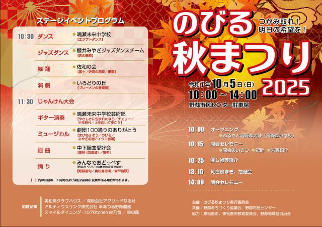 2025年10月5日に、野蒜ヶ丘にある、野蒜市民センター駐車場にて、のびる秋まつり2025が開催されます。準備もありますので、お祭り前日と当日は、こちらの駐車…