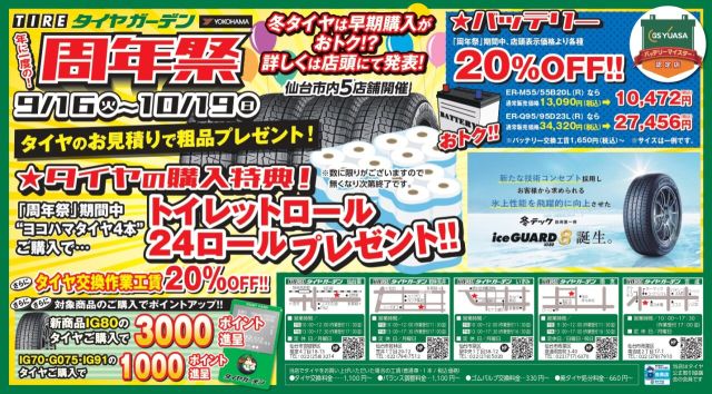 どーもー!仙台つーしんのせんだーいです! 今回はPR!『タイヤガーデン2025周年祭』が仙台市内5店舗で今年も開催! お見積り特典やご購入での先着特典もあるみ…