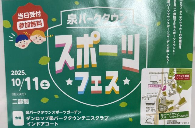 泉パークタウンでスポーツ好きも初心者も楽しめるイベント「スポーツフェス」が開催されます。日時は 2025年10月11日(土)、雨天でも実施予定。当日受付で参加…