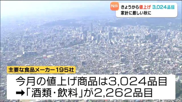帝国データバンクなどによりますと主要な食品メーカー195社で10月、値上げされる商品は3024品目です。このうち「酒類・飲料」が最も多く2262品目が値上げさ…