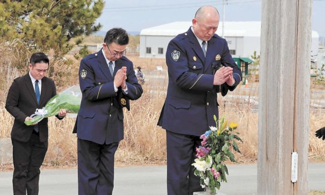 東日本大震災の発生から15年になるのを前に、若林署員が10日、津波で甚大な被害を受けた仙台市若林区荒浜地区の慰霊塔を訪れ、犠牲者を悼んだ。 大浦久義署長が「…