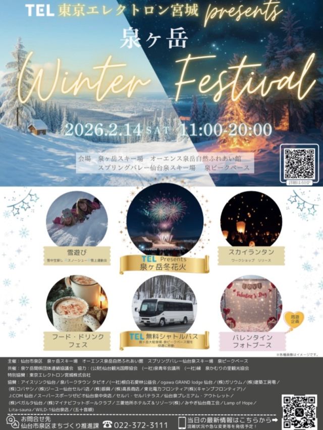泉ヶ岳で、今年初開催となる「泉ヶ岳Winterフェスティバル2026」が行われるみたいです。昼は雪あそび、夜にはスカイランタンや冬の花火もあって、一日中楽しめ…