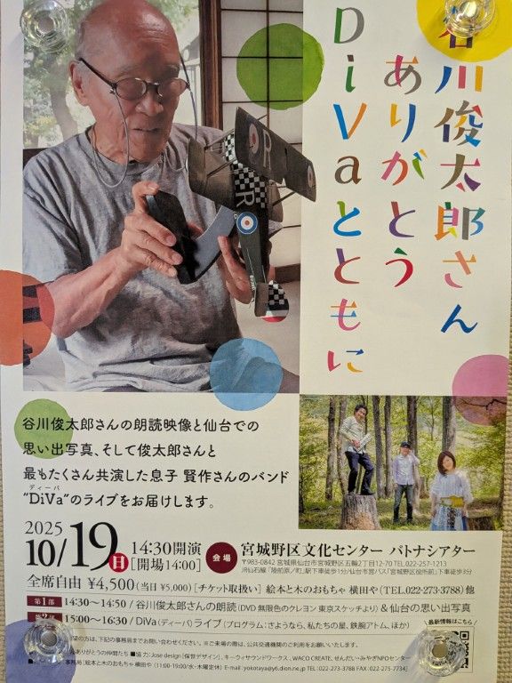 2025年10月19日(日)宮城野区文化センターにて「谷川俊太郎さんありがとうDiVaとともに」が開催されます。 開催時間:14:30開演(14:00開場) …