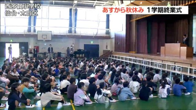 2学期制をとる宮城県内の多くの小学校で10月10日、1学期の終業式が行われ、秋休みを控えた子どもたちがこれまでの学びを振り返りました。このうち全校児童465人…