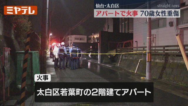 8日未明、仙台市内のアパートで2部屋を焼く火事があり、火元の部屋に住む70歳の女性が会話ができない状態で病院に搬送されました。