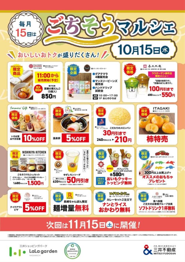 いかがお過ごしですか、nittaです。 仙台市太白区のララガーデン長町の店舗で、『ごちそうマルシェ』を2025年10月15日(水)に開催するみたいです。 毎月…