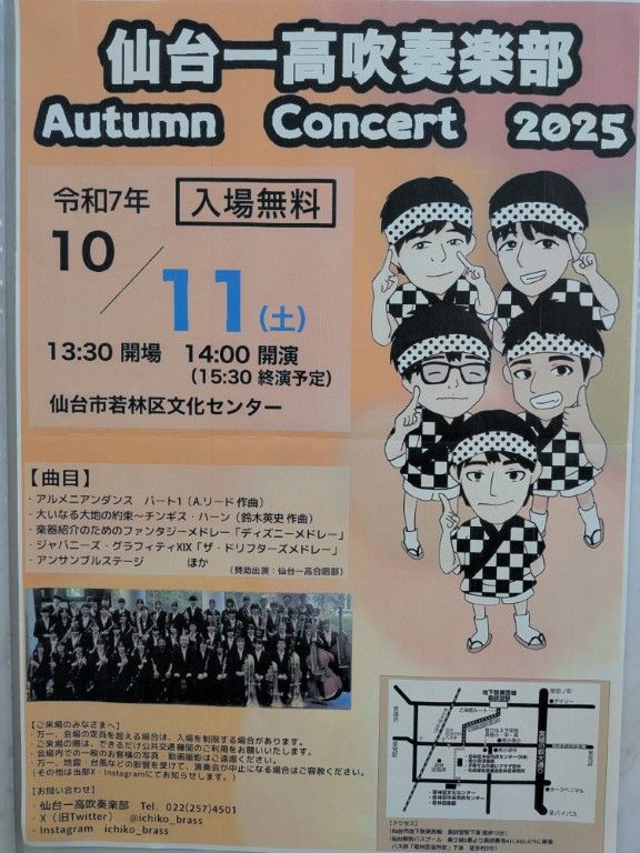 2025年10月11日(土)仙台市若林区文化センターにて「仙台一高吹奏楽部Autumn Concert 2025」が開催されます。 開催時間:13:30開場 …