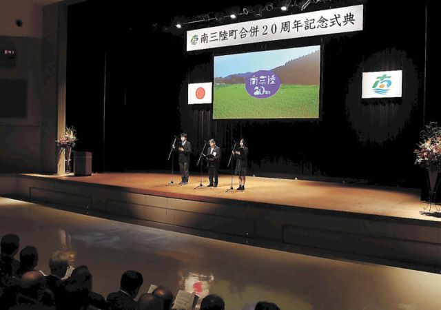 南三陸町の合併20周年を祝う式典が4日、町総合体育館であった。町民のほか、近隣市町や東日本大震災の復興を支援した関係自治体、団体の代表者ら約200人が出席し…