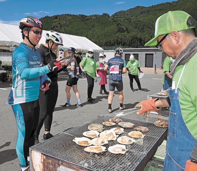 宮城県沿岸部を走る自転車イベント「ツール・ド・東北2025」(一般社団法人ツール・ド・東北、河北新報社主催)で、休憩所のエイドステーション(AS)で振る舞わ…