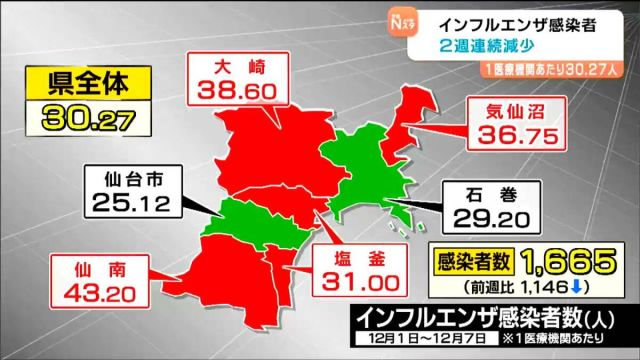 12月1日(月)の週、宮城県内の定点医療機関でインフルエンザと診断された人の数は1医療機関あたり30.27人でした。2週連続で減少したものの、県は依然、感染者…