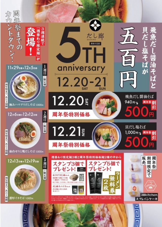 いかがお過ごしですか、nittaです。仙台市泉区長命ヶ丘のブランチ仙台WESTに出店するラーメン店『だし廊長命ヶ丘店』の5周年祭を2025年12月20日(日)…