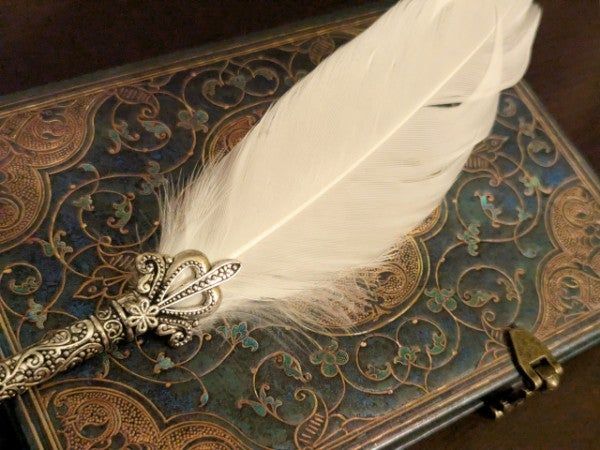 セリアの文房具コーナーをのぞいたら、某魔法学校での生活を想像させる素敵アイテムを発見しました。 天然の羽を使用した「羽根ペン」です。 羽根は白・青・黒…