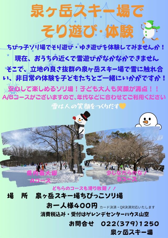 今年も、泉ヶ岳スキー場のちびっ子ソリ遊び場がオープンするみたいです.泉ヶ岳のふもとに、子どもたちが安心して遊べるソリ専用エリアが登場。スキーやスノーボードとは…