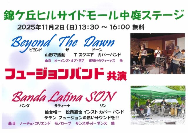 いかがお過ごしですか、nittaです。仙台市青葉区の錦ケ丘ヒルサイドモール・中庭ステージで、『フュージョンカバーライブ』を、2025年11月2日(日)に開催す…