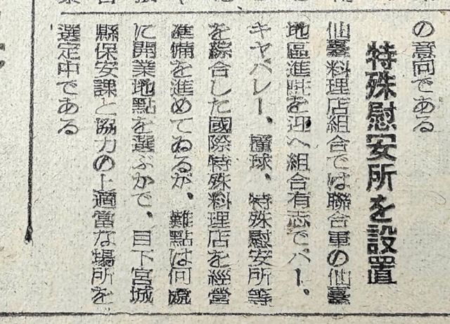 戦後間もなく進駐軍向けの「慰安施設」で働き、施設閉鎖後は「街娼(がいしょう)」となった宮城県内の女性たちについての証言や記録は限られる。当時の河北新報の記事…