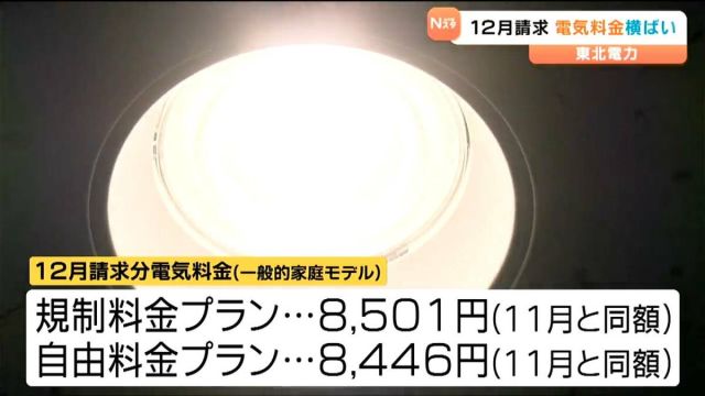 東北電力の12月請求分の電気料金は、一般的な家庭のモデルで前の月と変わらず8,501円となりました。東北電力によりますと、12月請求分の一般的な家庭モデルの電…