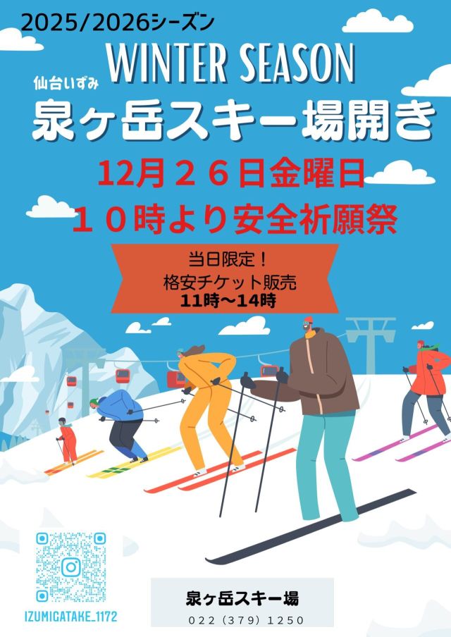 今年もいよいよ、泉ヶ岳スキー場のシーズンが始まりますね〜。オープンは12月26日(金)。当日は安全祈願祭があって、格安チケットの販売もあるそうです。泉ヶ岳スキ…