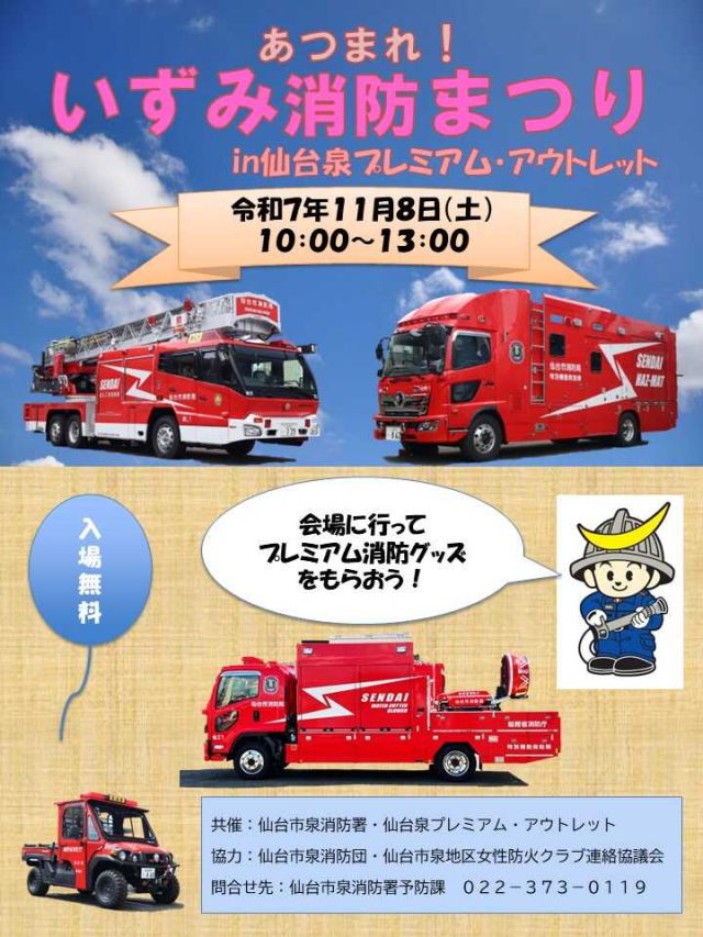 仙台泉プレミアム・アウトレットで、「いずみ消防まつり」というイベントが行われるみたいです。消防音楽隊の演奏もあるそうですよ。非常食の試食ができる「サバ・メシ体…