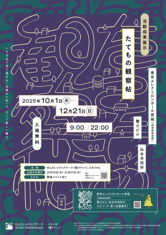 宮城のせんだいメディアテークにて、「たてもの観察帖―東京エレクトロンホール宮城(宮城県民会館)・電力ビル・仙台市役所」が2025年12月21日まで開催していま…