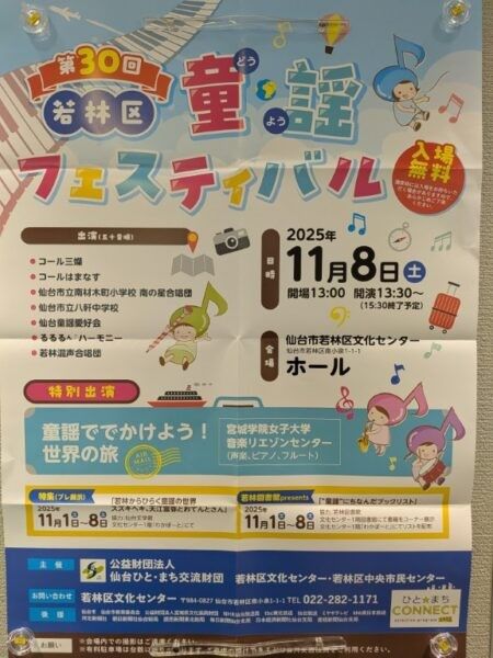 2025年11月8日(土)若林区文化センターにて「第30回若林区童謡フェスティバル」が開催されます。 開催時間:開場13:00、開演13:30(15:30終了…