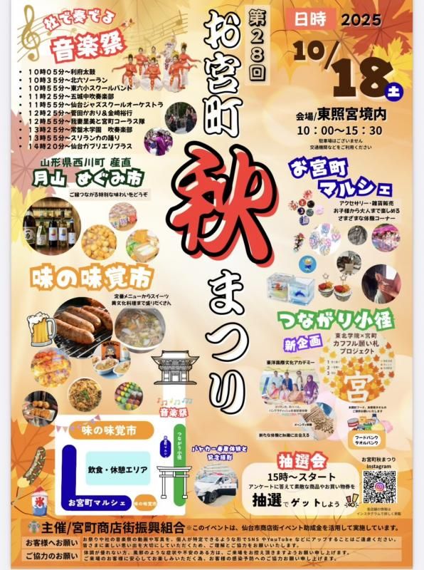 いかがお過ごしですか、nittaです。 仙台市青葉区の仙台東照宮の境内で、『第28回お宮町秋まつり』を、2025年10月18日(土)に開催するみたいです。(1…