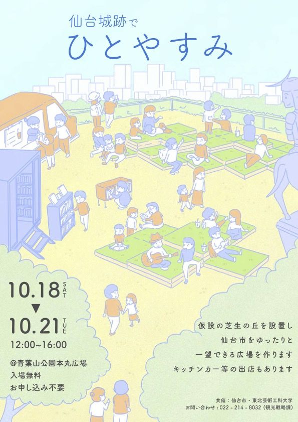 10月の中旬、仙台城跡の本丸広場でちょっと気になる催しが行われます。名前は「仙台城跡でひとやすみ」。人工芝やキッチンカーを取り入れて、ふらっと立ち寄れるような…
