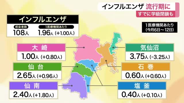 全国的に患者数の増加が確認されているインフルエンザについて、宮城県内でも先週の患者数が1医療機関あたりで1人を超え、流行シーズンに入りました。 県によります…