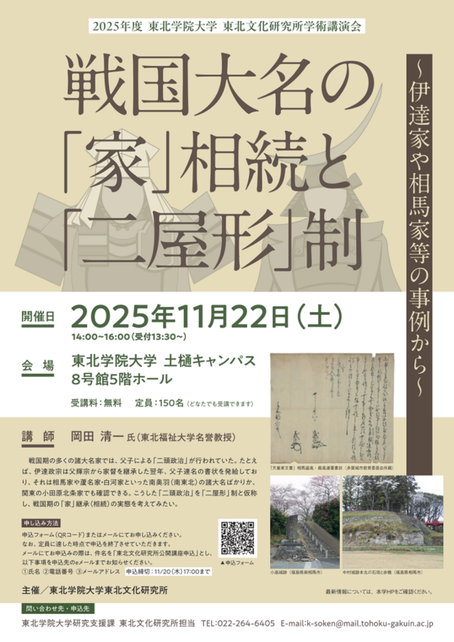 11月22日(土)、東北福祉大学 土樋キャンパス(宮城県仙台市)において2025年度 東北学院大学 東北文化研究所学術講演会「戦国大名の「家」相続と「二屋形」…