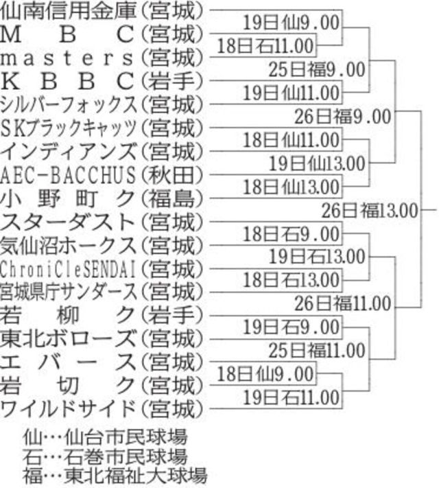 第20回宮城県軟式野球東北選抜大会(宮城県軟式野球協議会、河北新報社主催)は18日、仙台市民、石巻市民の両球場で開幕する。岩手、宮城、秋田、福島4県の計18…