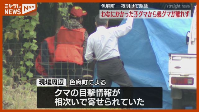 15日夜、宮城・色麻町の雑木林に設置していたわなにかかった子グマのそばを、親グマが離れない状況が続き、一夜明けた16日朝 猟友会によって2頭とも駆除されました。