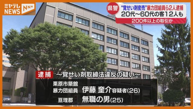 宮城県警は、覚せい剤の密売人をしていた暴力団組員の男ら2人と客12人を、30日までに逮捕しました。 密売人の2人は、200件以上の取引をしていたとみられます。