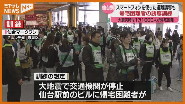 大地震による仙台駅周辺の帰宅困難者を 一時滞在場所に誘導する訓練が、行われました。 今回は、初めてスマートフォンを使った避難誘導が行われました。