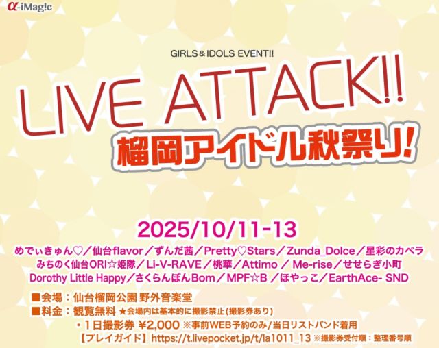 いかがお過ごしですか、nittaです。 仙台市宮城野区の榴岡公園・野外音楽堂で、『LIVE-ATTACK!! in 榴岡アイドル秋祭り!』を、2025年10月…