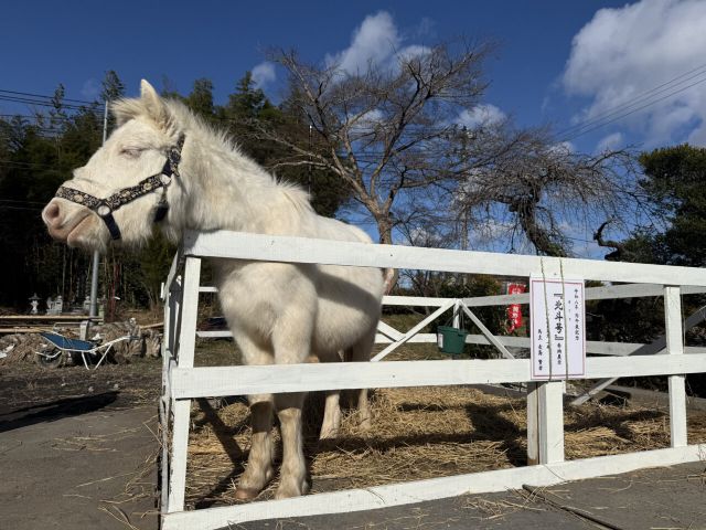 泉区実沢にある熊野神社に、三が日に初詣に行ったんですが、駐車場から境内にはいってすぐのところに白い馬がいました!白くて大きくて、でもすごく落ち着いた様子で立っ…
