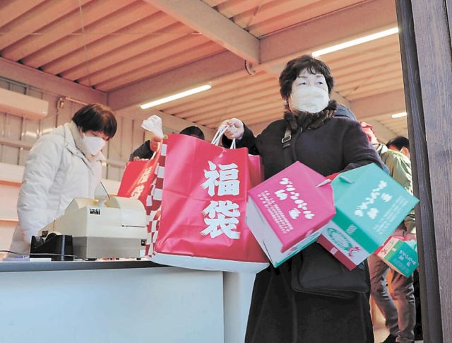 村田町の道の駅村田で3日、新春恒例の初売りが始まり、地元野菜を詰め込んだ福袋を目当てに多くの買い物客でにぎわった。4日まで。 白菜や大根、里芋などの7種10…