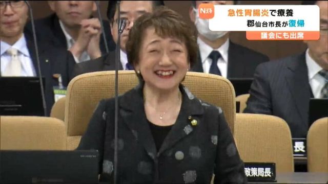 急性胃腸炎のため先週から療養していた仙台市の郡和子市長が、24日に公務に復帰しました。郡仙台市長は、24日午後、市議会の特別予算委員会に出席し、議員らに元気な…