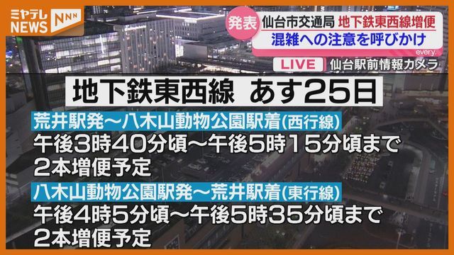 25日~26日に国公立大学2次試験が実施されるのに伴い、仙台市交通局は地下鉄東西線の増便を発表し、混雑への注意を呼びかけています。 仙台市交通局によりますと…
